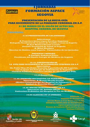 Se ha celebrado el día 21 de marzo en el Hospital General de Segovia, la I Jornadas Formación ASPACE Segovia, que ha servido para la presentación de la nueva Guía para el seguimiento de la Parálisis Cerebral en Atención Primaria, siendo autores la Junta de Castilla y León ( Gerencia Regional de Salud, Gerencia de Servicios Sociales) y la Federación ASPACE de Castilla y León.